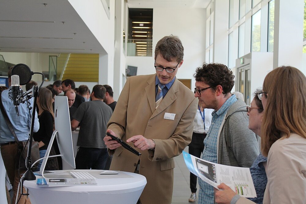 "Alle Stände haben mir etwas Neues zeigen können", so Dipl.-Ing. Heiko Tennert, Leiter Rechenkabinett (Multimedialabor) und Netzwerkadministration der Fakultät Informatik und Medien. Über zu wenig Andrang konnte sich wohl keiner der Experten an den Infoständen beschweren. Gerade die Legetechnik, bei der man auf dem Bildschirm sieht, wie zwei Hände immer neue Bilder aus einfachen ausgeschnittenen Formen legen, hielten viele Gäste für gut umsetzbar, auch Prof. Ulrich Müller von der Fakultät Bauwesen: "Es ist gut, hier versammelt einmal die Möglichkeiten zu sehen, die es gibt. Ich nutze ab und zu Youtube-Videos in meiner Bauphysik-Vorlesung, das kommt gut an. Am besten für meine Zwecke scheint mir die Legetechnik zu sein, deswegen habe ich sie mir von Herrn Mensel einmal ausführlich erklären lassen. Ich bin allerdings skeptisch, was den Aufwand betrifft, solche Videos selbst zu erstellen."